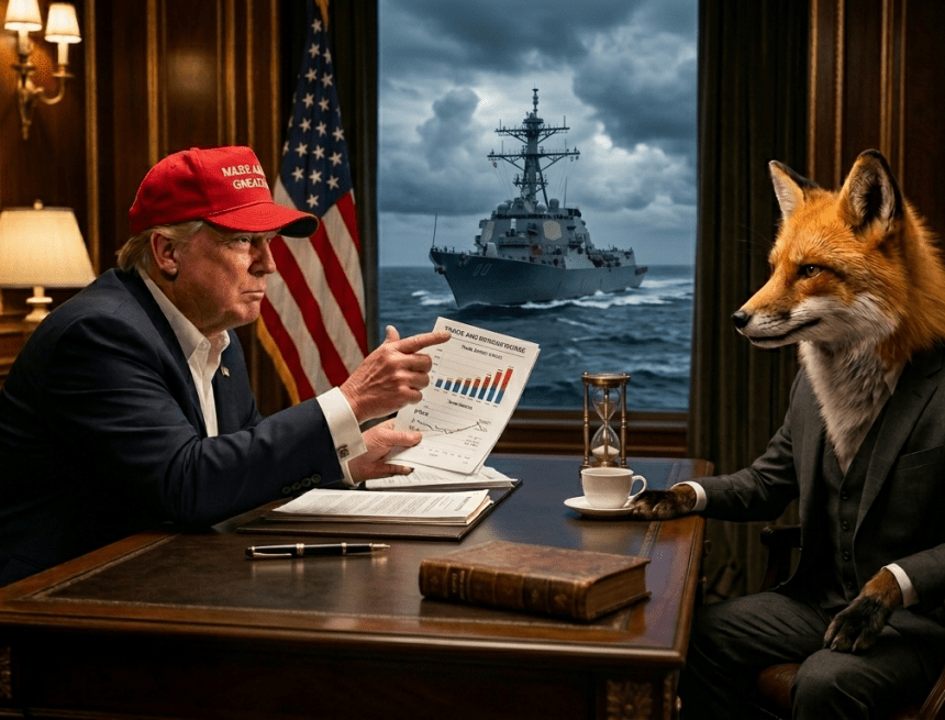 (المكان: مكتبُ “مارالاغو”. ترامب يقلبُ حزمةً من الرسومِ البيانيةِ للعجزِ التجاري بغضب، بينما الثعلب “أبو الصفقات” يجلسُ بوقارٍ ببدلتهِ الرمادية،...