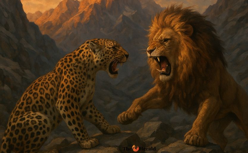 تخيل هذا: النَّمِر الفارسي، نحيل ورشيق، يقترب من نبع جبلي صاف عند الفجر. ينحني ليشرب. ثم، دون إنذار، من العشب العالي ينطلق الأسد الصاعد – أسد بفراء ذهبي وزئير يشق الهواء كالرعد. النَّمِر لا يسمعه في الوقت المناسب. الأسد يضرب، مخالبه تمزق عميقًا، جرح قاتل تقريبًا. النَّمِر يعرج إلى الظلال، ينزف ومذهول.