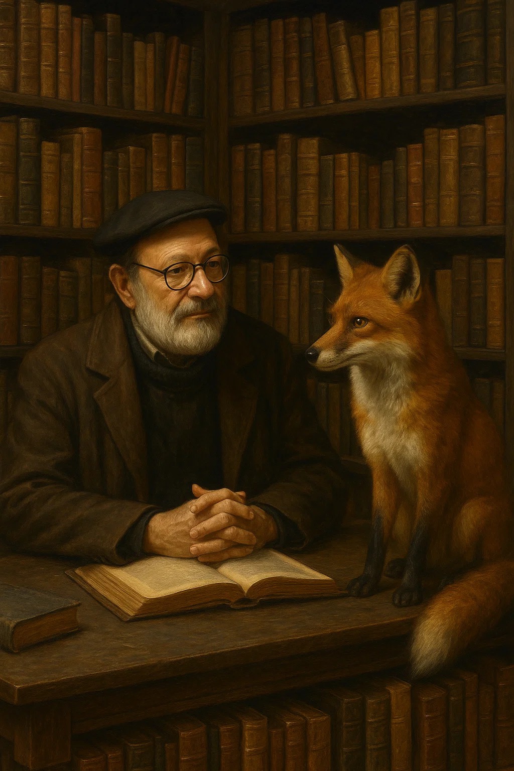 احتل الثعلب مكانه على الطاولة بخفة مميزة، ثم أدار رأسه بفضول: “أتعني بهذا أن القيمة الحقيقية تكمن في ذلك الحيز السحري بين الأغلفة المغلقة، لا في السطور المكشوفة؟”