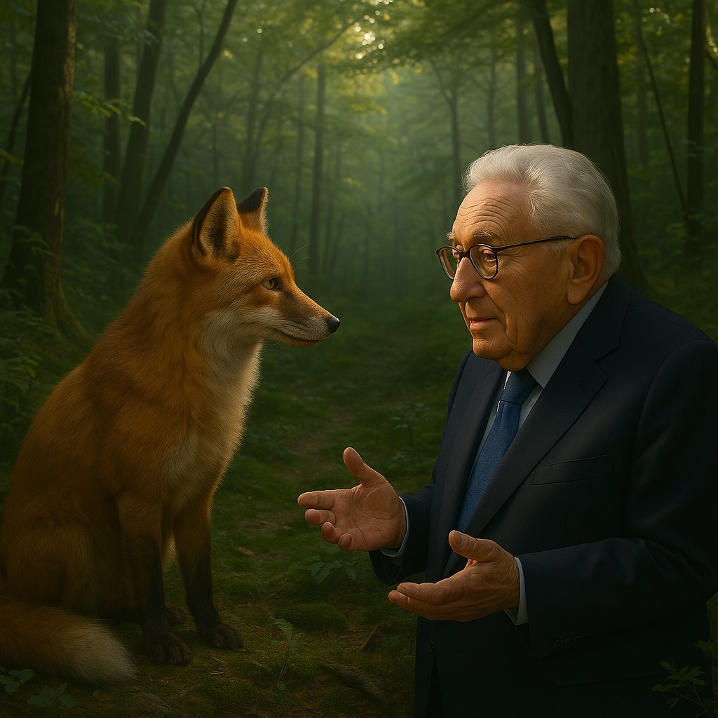 الثعلب ملقيا سؤاله كظل القمر : (يلقي حصاة في الماء، محدثا دوائر متتالية وهزات متوازية) سيد كسنجر، ذكرنا فيما سبق أن البقاء للأذكى، لكن ماذا لو واجه الذكي من لا يتعرف إطلاقا بقواعد الذكاء؟ مثلا صاحب قوة أرعن، وغُرير أعمى، يهاجم دون منطق ؟